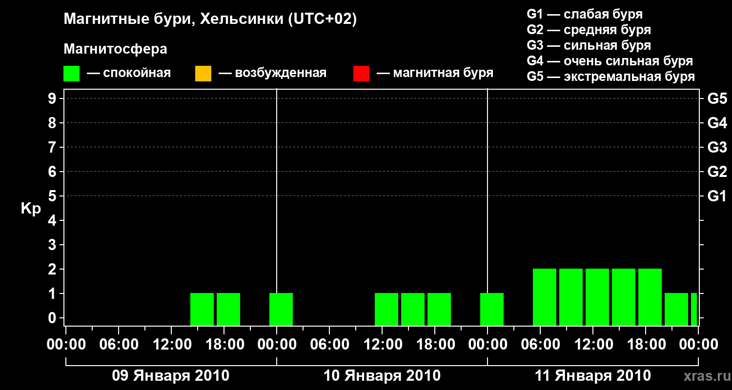 Изменения геомагнитного индекса Kp с 9 по 11 января 2010 года для средних широт