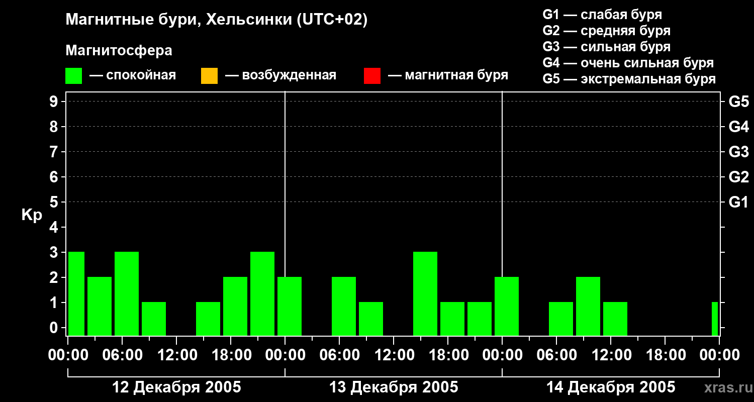 Изменения геомагнитного индекса Kp с 12 по 14 декабря 2005 года для средних широт