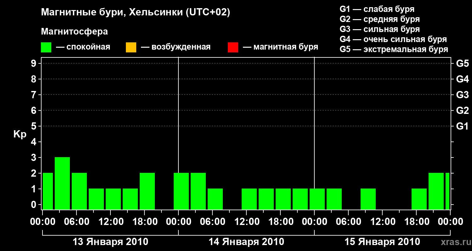 Изменения геомагнитного индекса Kp с 13 по 15 января 2010 года для средних широт