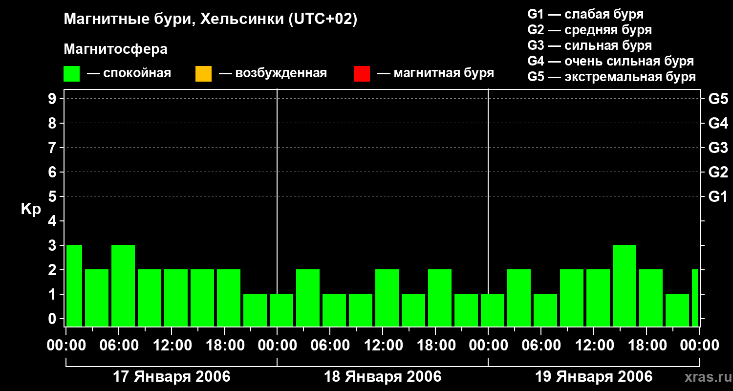 Изменения геомагнитного индекса Kp с 17 по 19 января 2006 года для средних широт