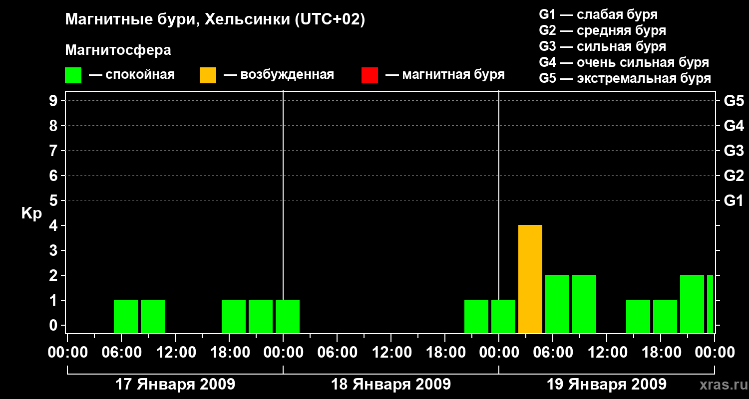 Изменения геомагнитного индекса Kp с 17 по 19 января 2009 года для средних широт