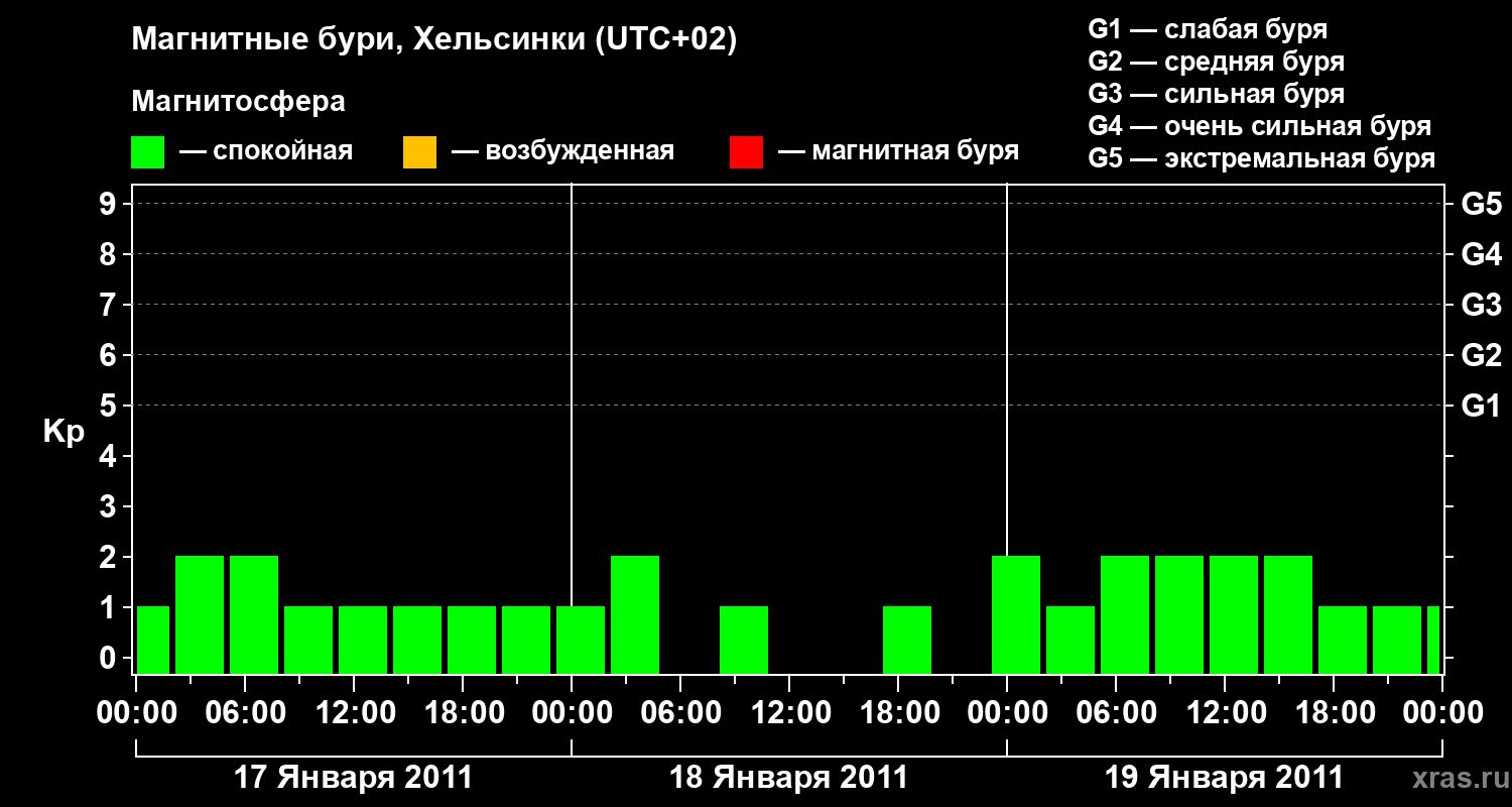 Изменения геомагнитного индекса Kp с 17 по 19 января 2011 года для средних широт