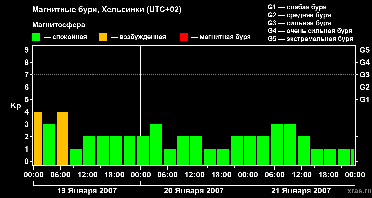 Изменения геомагнитного индекса Kp с 19 по 21 января 2007 года для средних широт