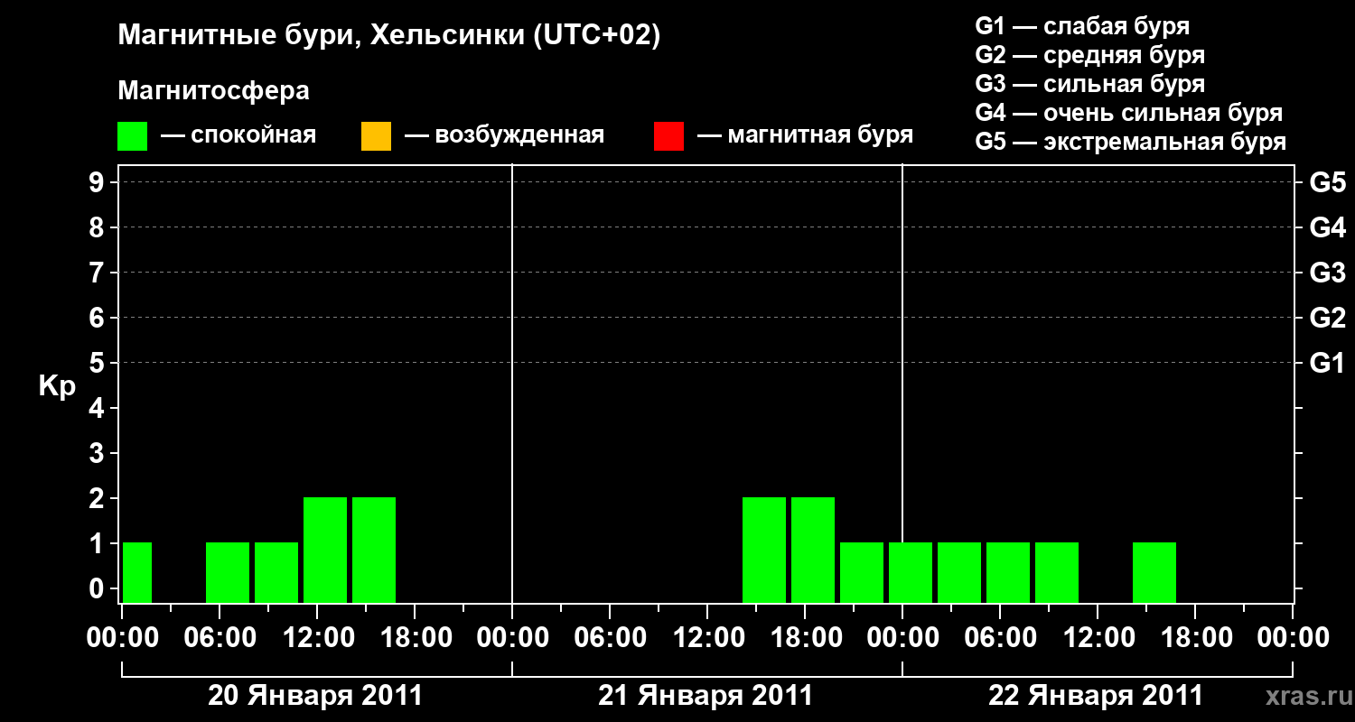Изменения геомагнитного индекса Kp с 20 по 22 января 2011 года для средних широт
