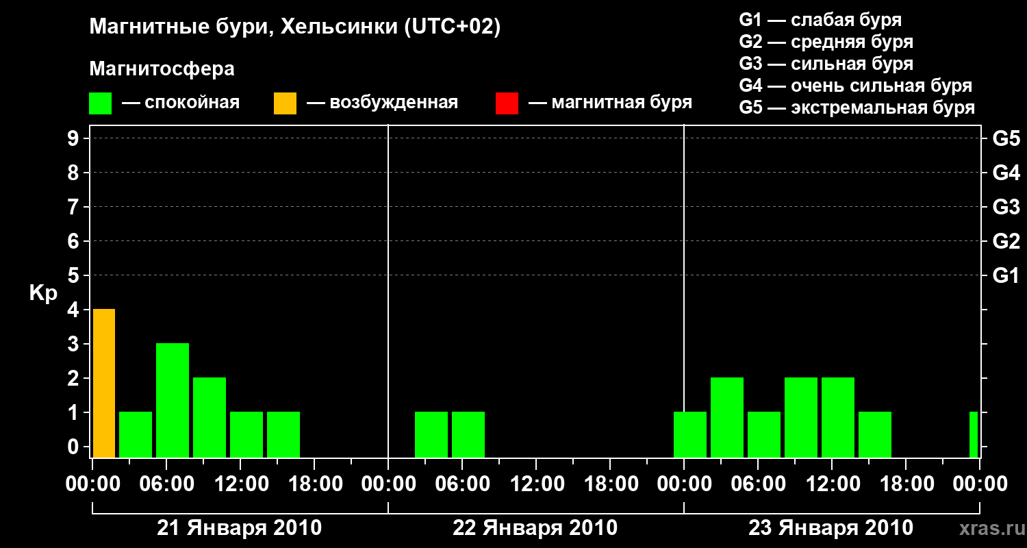 Изменения геомагнитного индекса Kp с 21 по 23 января 2010 года для средних широт