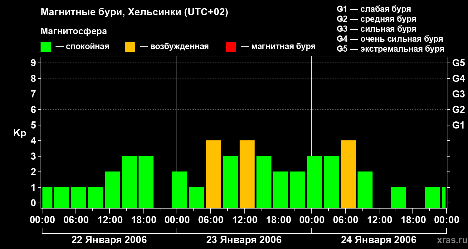 Изменения геомагнитного индекса Kp с 22 по 24 января 2006 года для средних широт