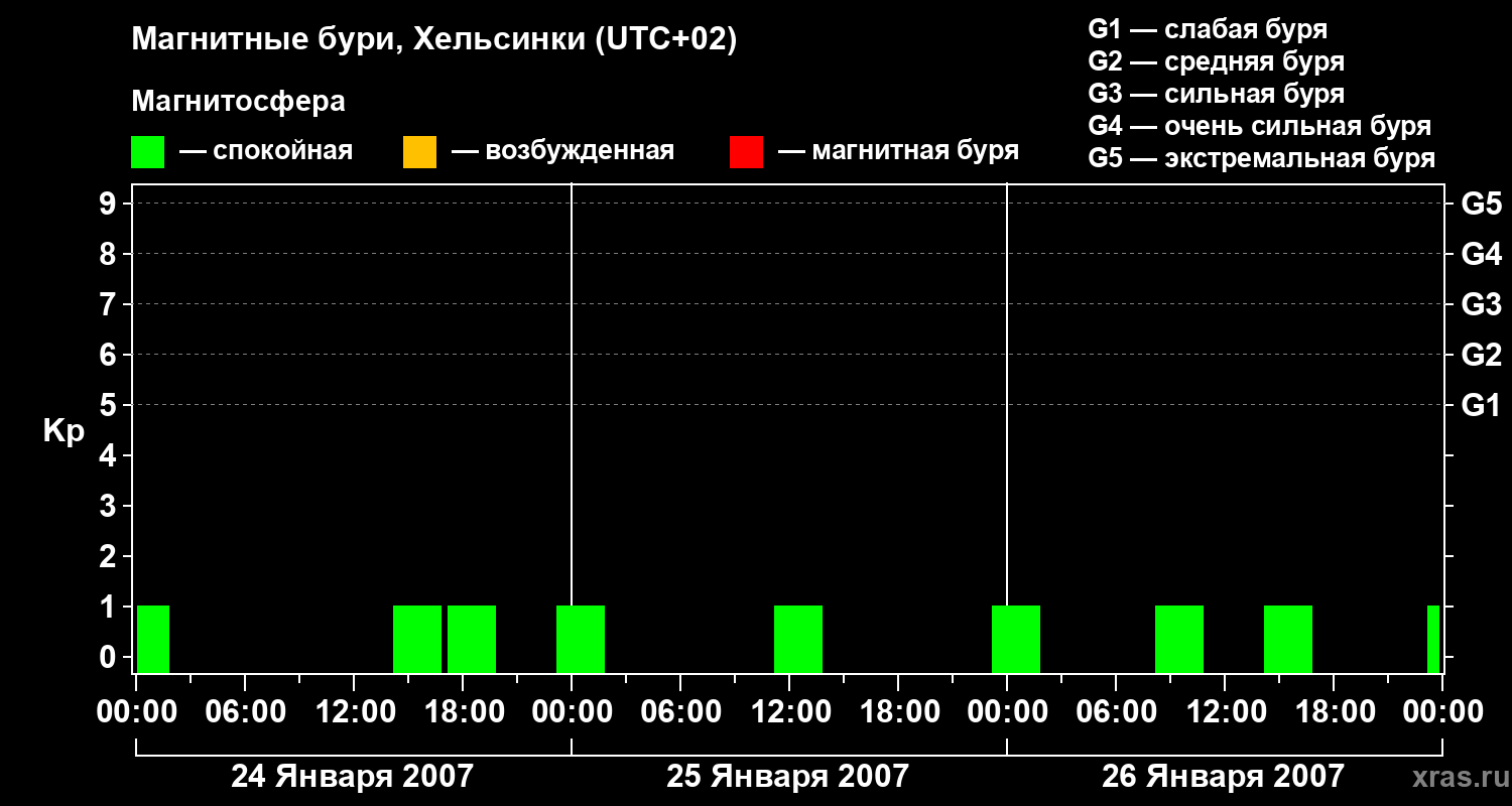 Изменения геомагнитного индекса Kp с 24 по 26 января 2007 года для средних широт