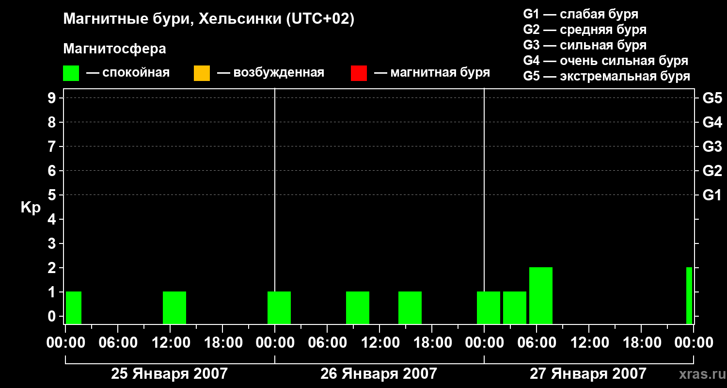 Изменения геомагнитного индекса Kp с 25 по 27 января 2007 года для средних широт