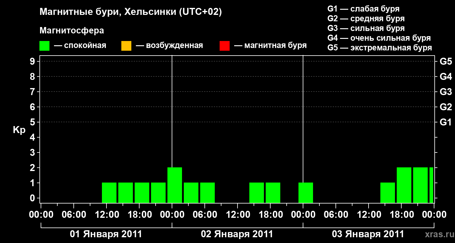 Изменения геомагнитного индекса Kp с 1 по 3 января 2011 года для средних широт