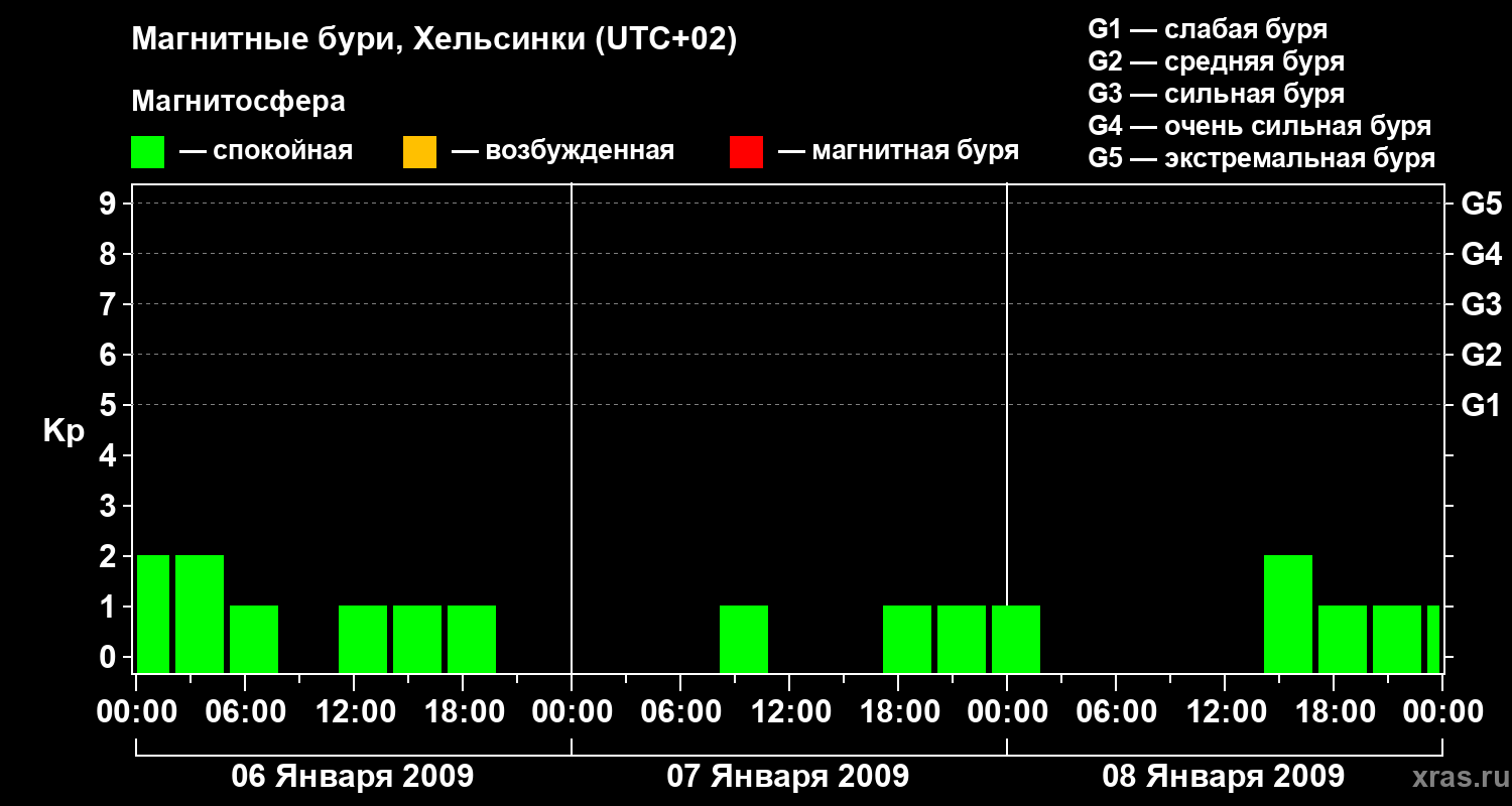 Изменения геомагнитного индекса Kp с 6 по 8 января 2009 года для средних широт