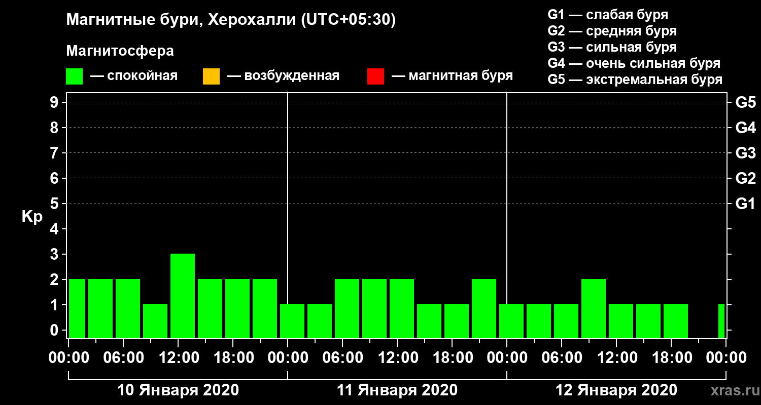 Изменения геомагнитного индекса Kp с 10 по 12 января 2020 года для средних широт