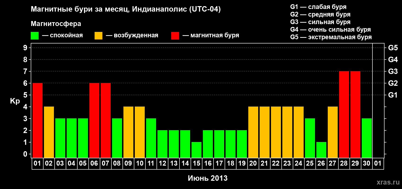 Изменения максимального суточного геомагнитного индекса Kp в июне 2013 года для средних широт