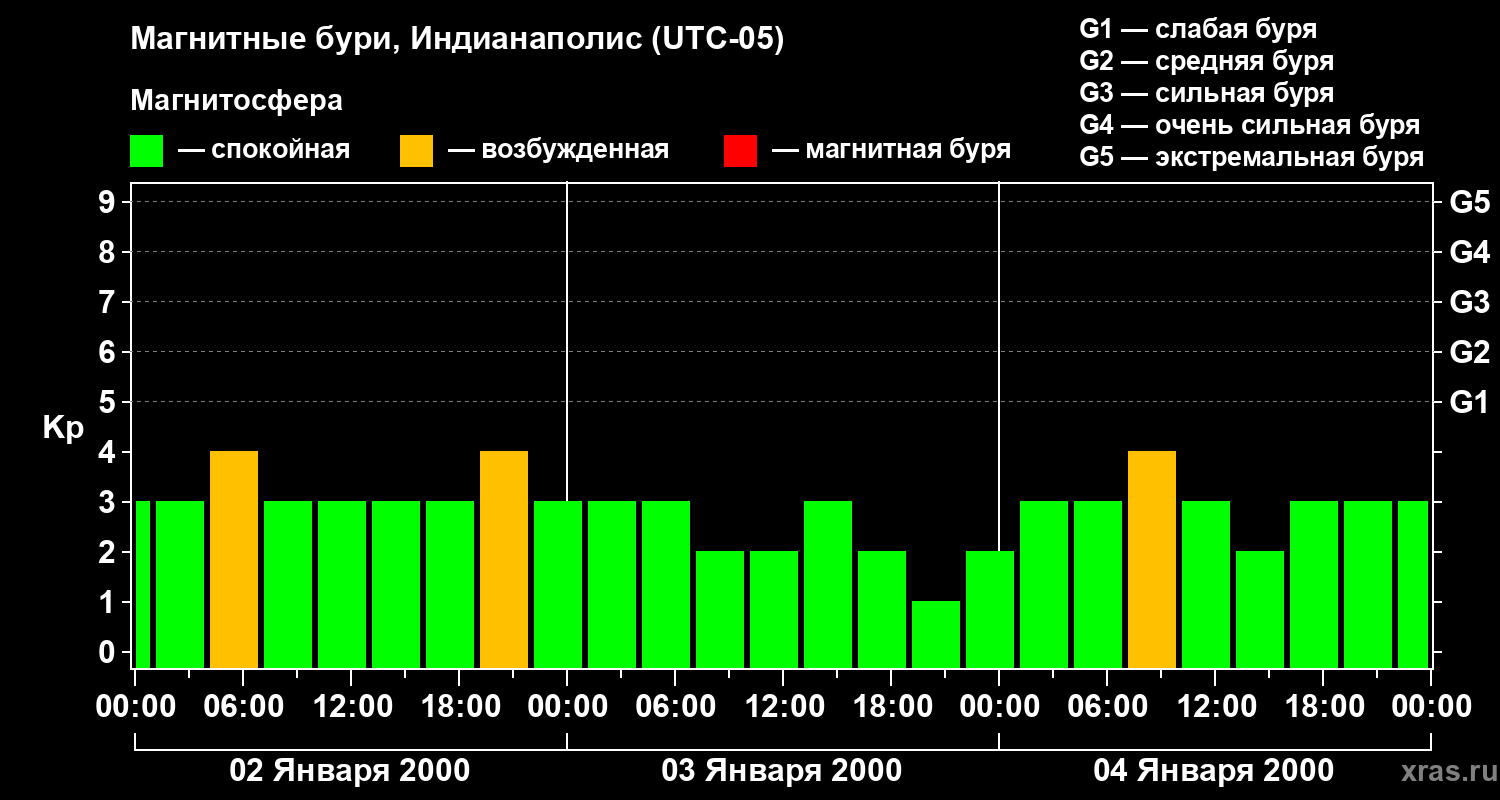 Изменения геомагнитного индекса Kp с 2 по 4 января 2000 года для средних широт