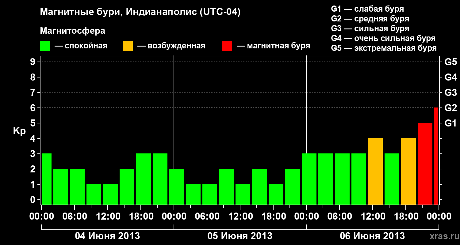 Изменения геомагнитного индекса Kp с 4 по 6 июня 2013 года для средних широт