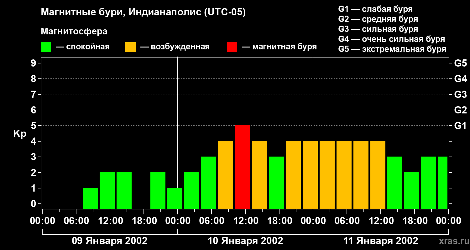 Изменения геомагнитного индекса Kp с 9 по 11 января 2002 года для средних широт
