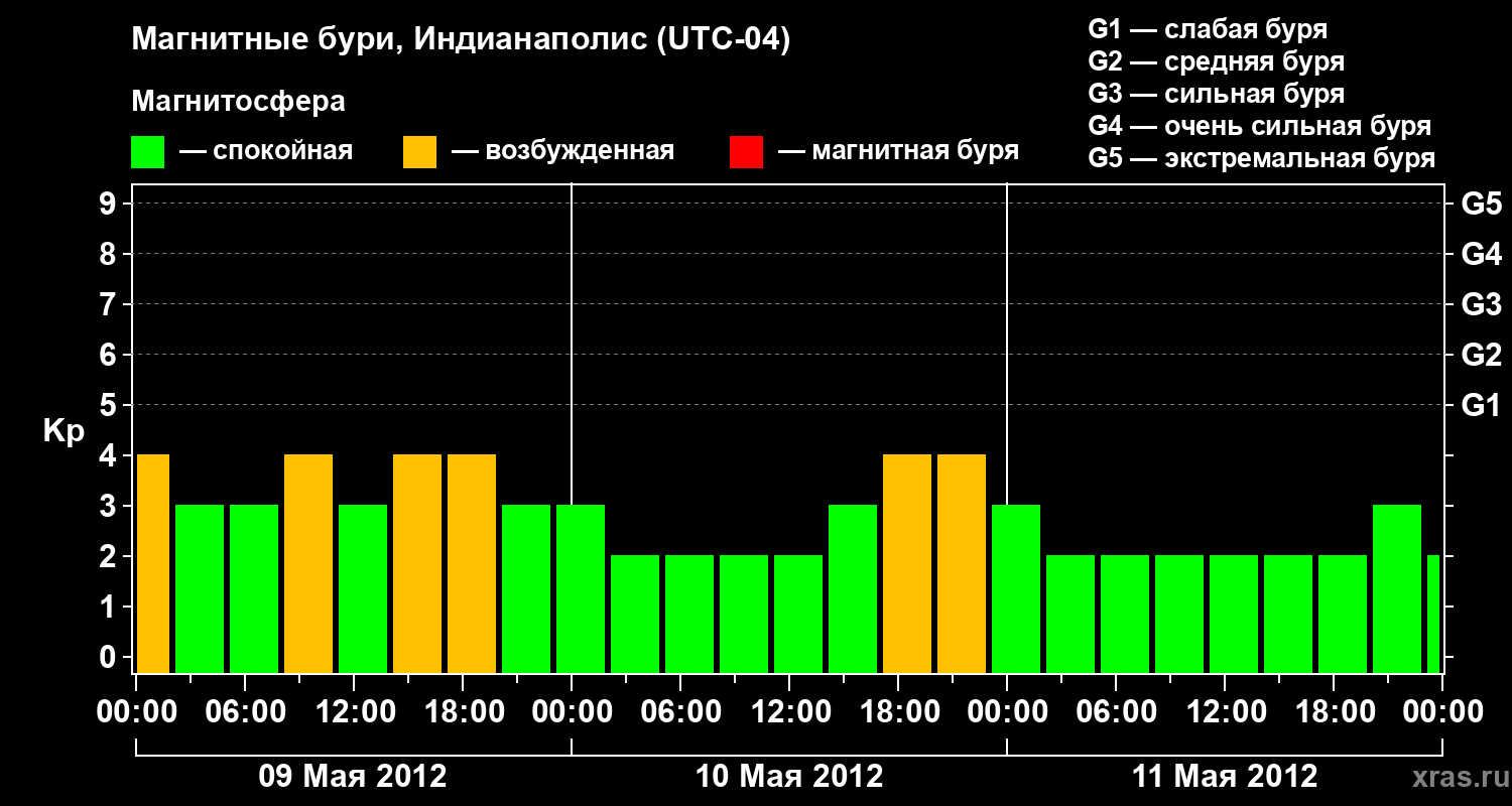 Изменения геомагнитного индекса Kp с 9 по 11 мая 2012 года для средних широт