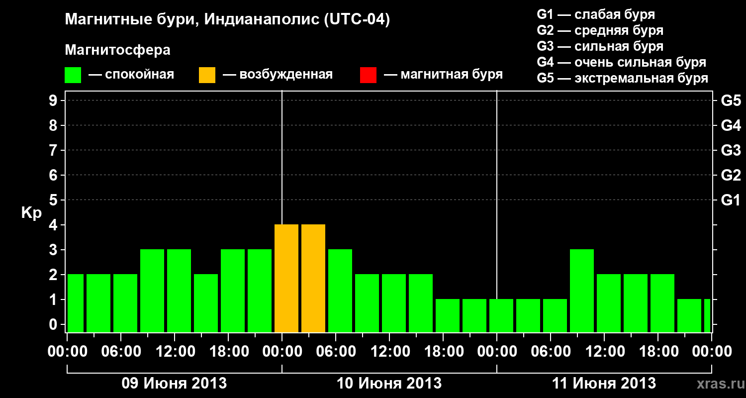 Изменения геомагнитного индекса Kp с 9 по 11 июня 2013 года для средних широт
