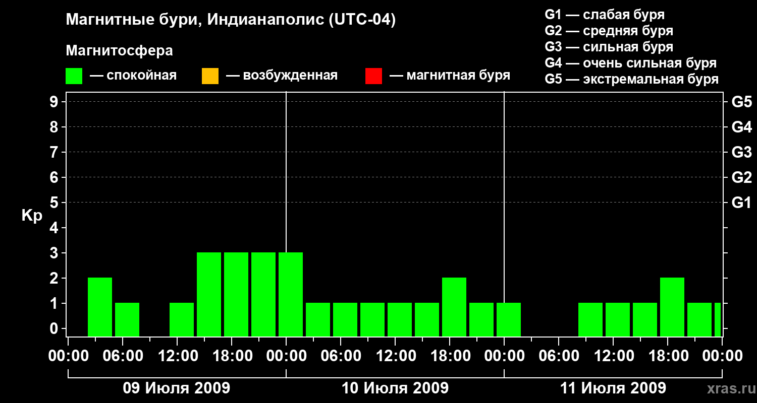 Изменения геомагнитного индекса Kp с 9 по 11 июля 2009 года для средних широт