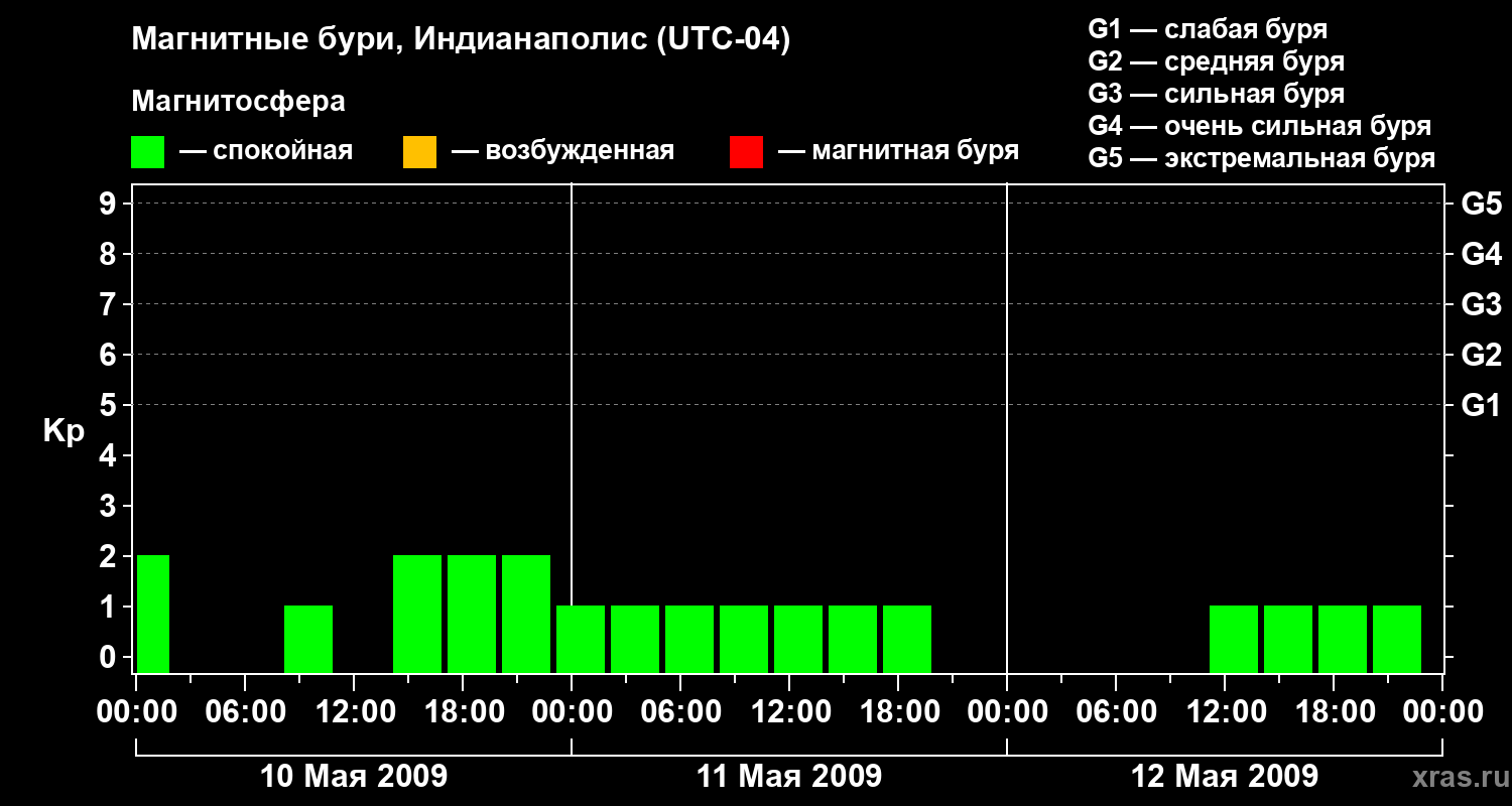 Изменения геомагнитного индекса Kp с 10 по 12 мая 2009 года для средних широт