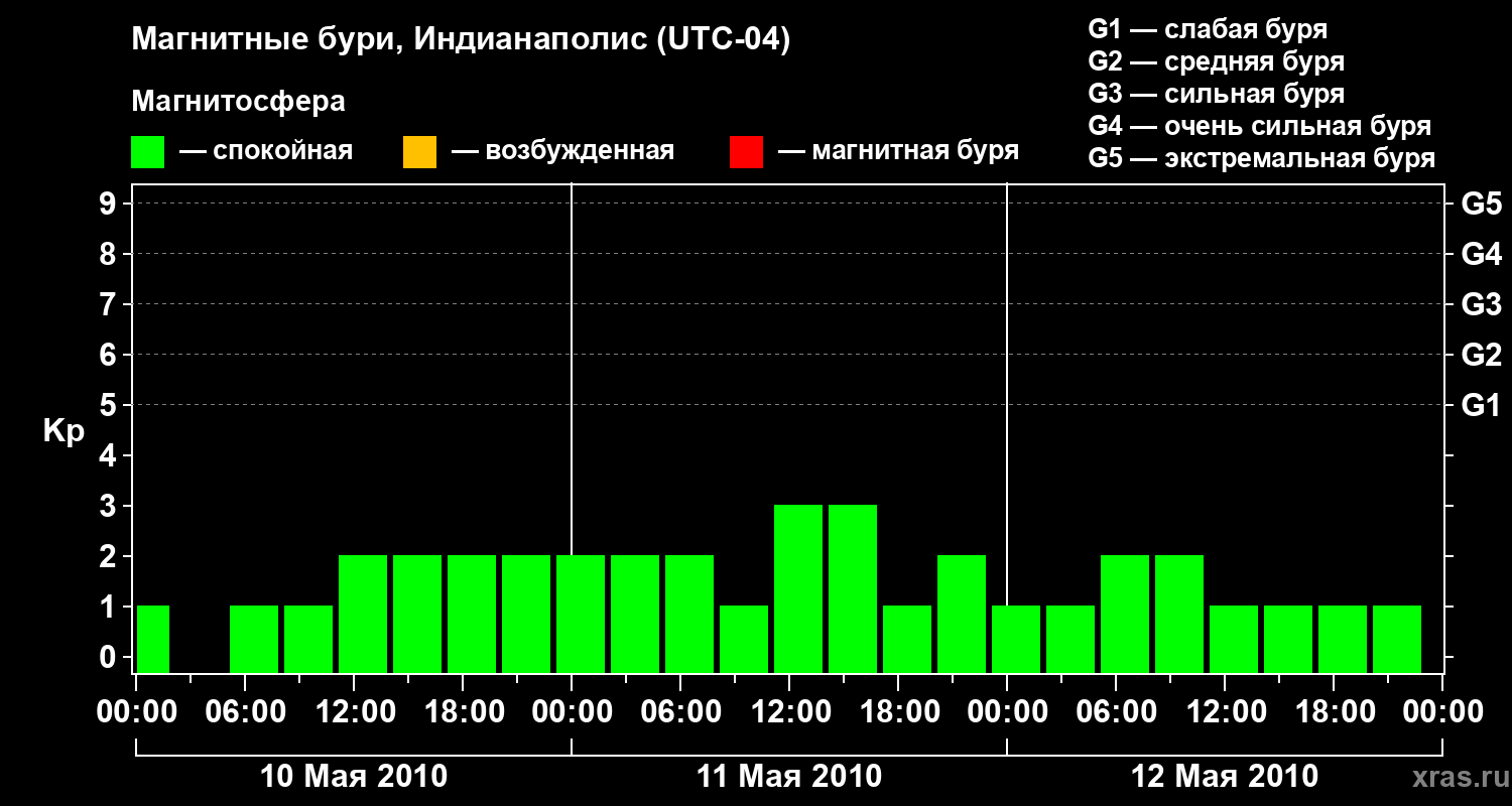 Изменения геомагнитного индекса Kp с 10 по 12 мая 2010 года для средних широт