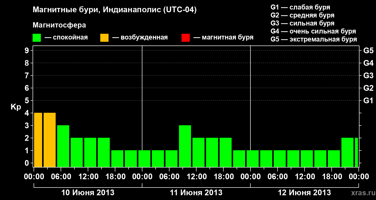 Изменения геомагнитного индекса Kp с 10 по 12 июня 2013 года для средних широт