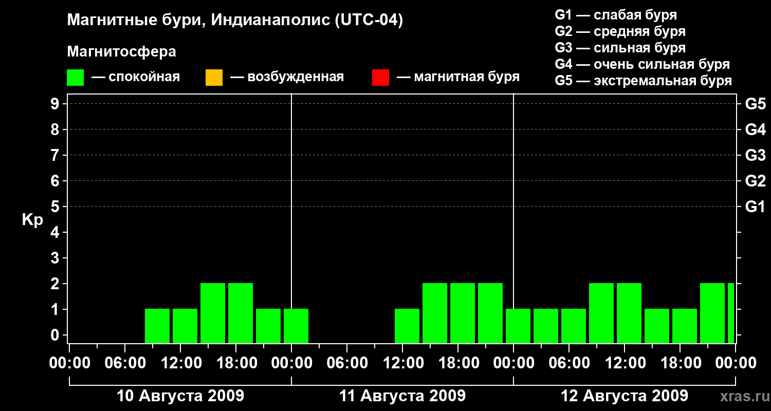 Изменения геомагнитного индекса Kp с 10 по 12 августа 2009 года для средних широт