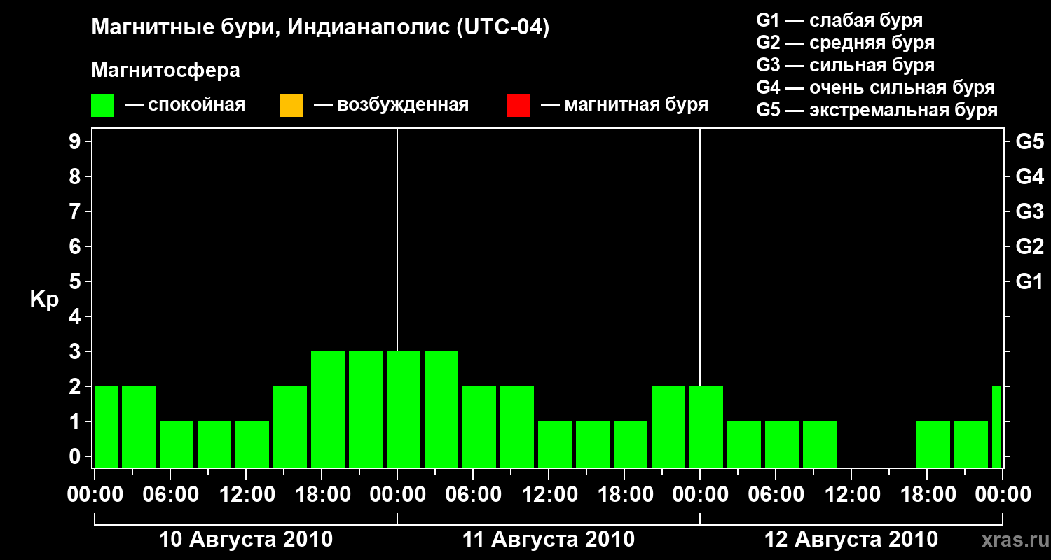 Изменения геомагнитного индекса Kp с 10 по 12 августа 2010 года для средних широт