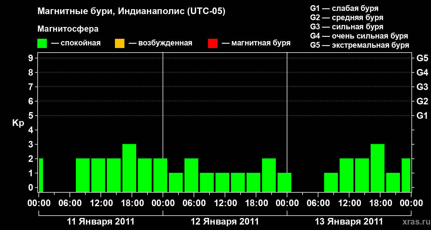Изменения геомагнитного индекса Kp с 11 по 13 января 2011 года для средних широт