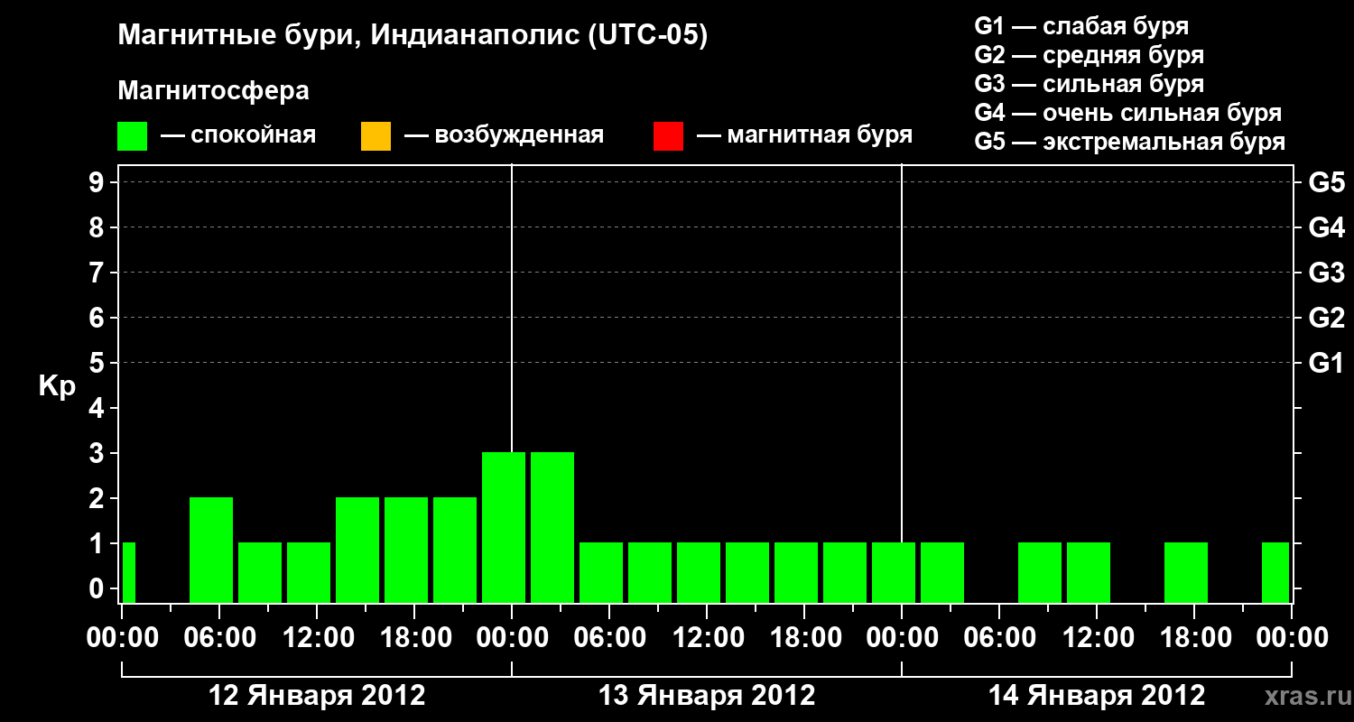 Изменения геомагнитного индекса Kp с 12 по 14 января 2012 года для средних широт