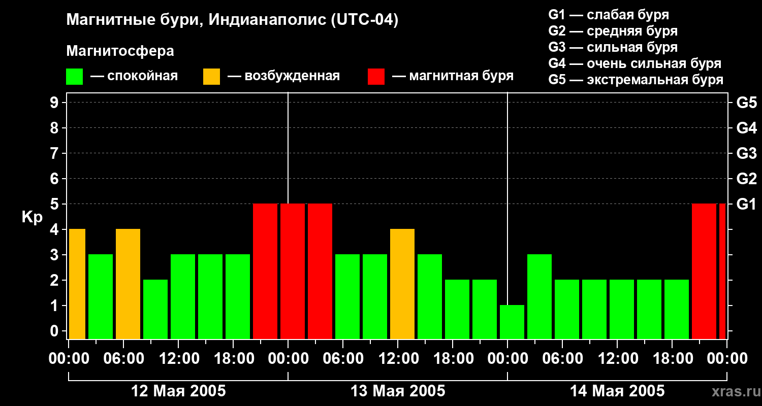 Изменения геомагнитного индекса Kp с 12 по 14 мая 2005 года для средних широт