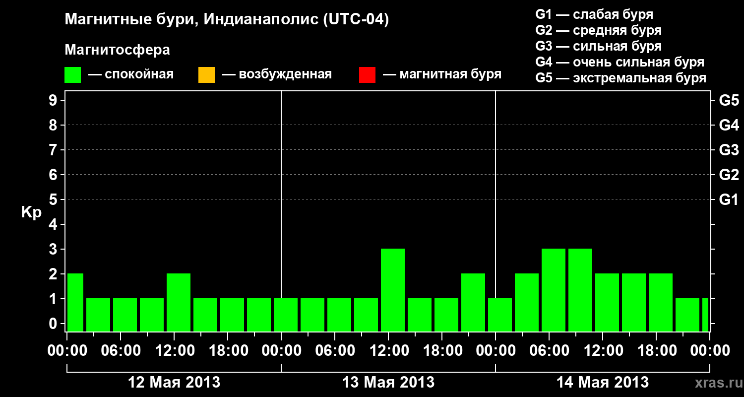 Изменения геомагнитного индекса Kp с 12 по 14 мая 2013 года для средних широт