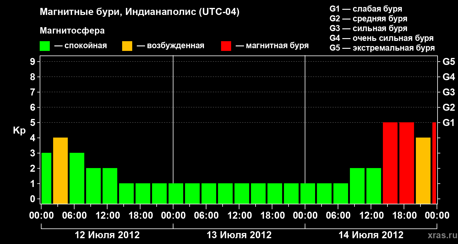 Изменения геомагнитного индекса Kp с 12 по 14 июля 2012 года для средних широт