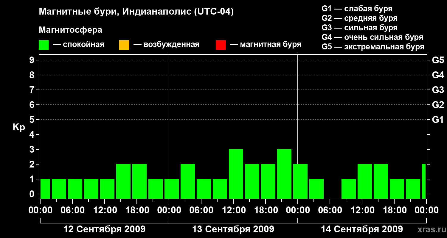 Изменения геомагнитного индекса Kp с 12 по 14 сентября 2009 года для средних широт