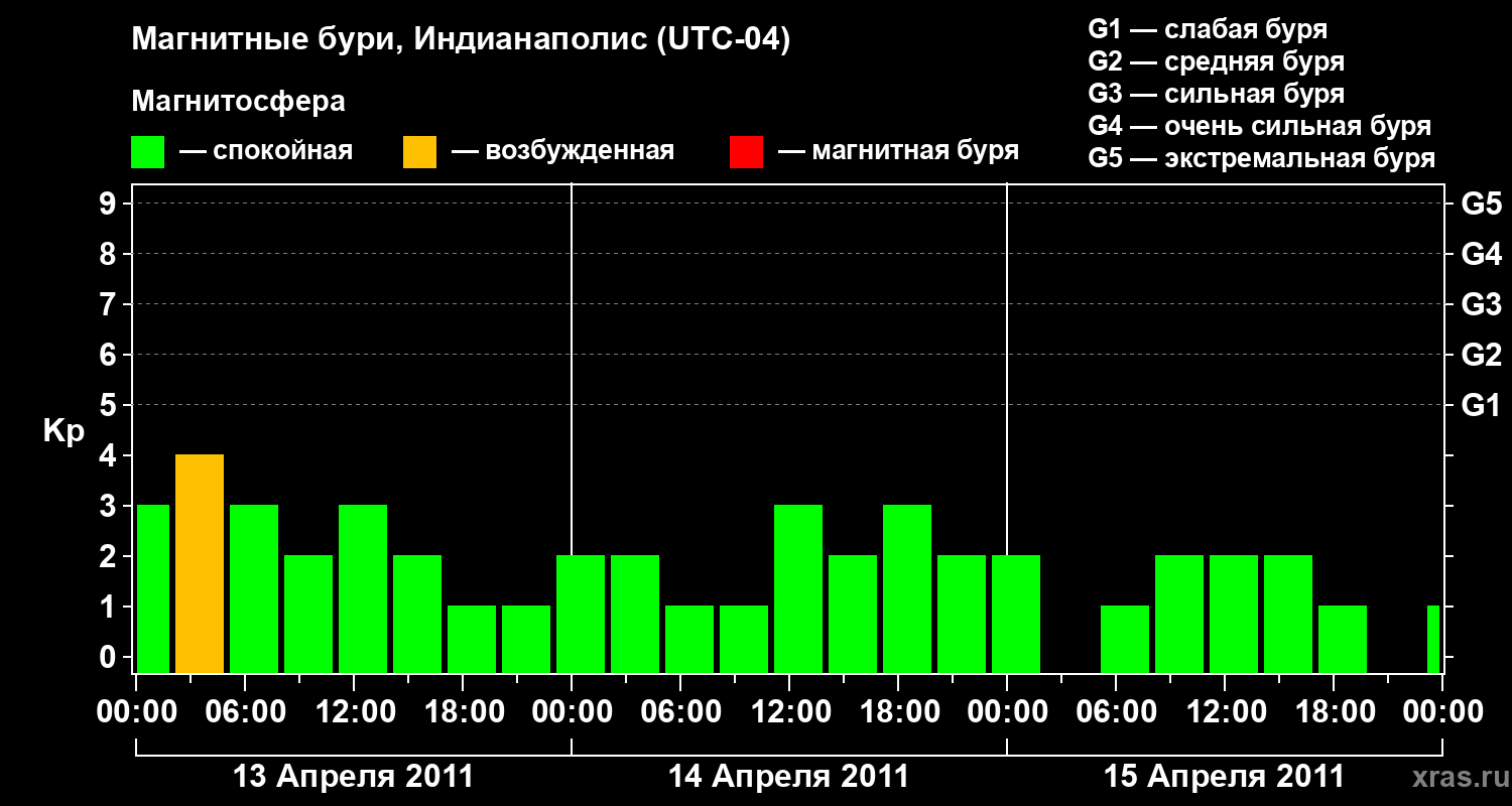 Изменения геомагнитного индекса Kp с 13 по 15 апреля 2011 года для средних широт