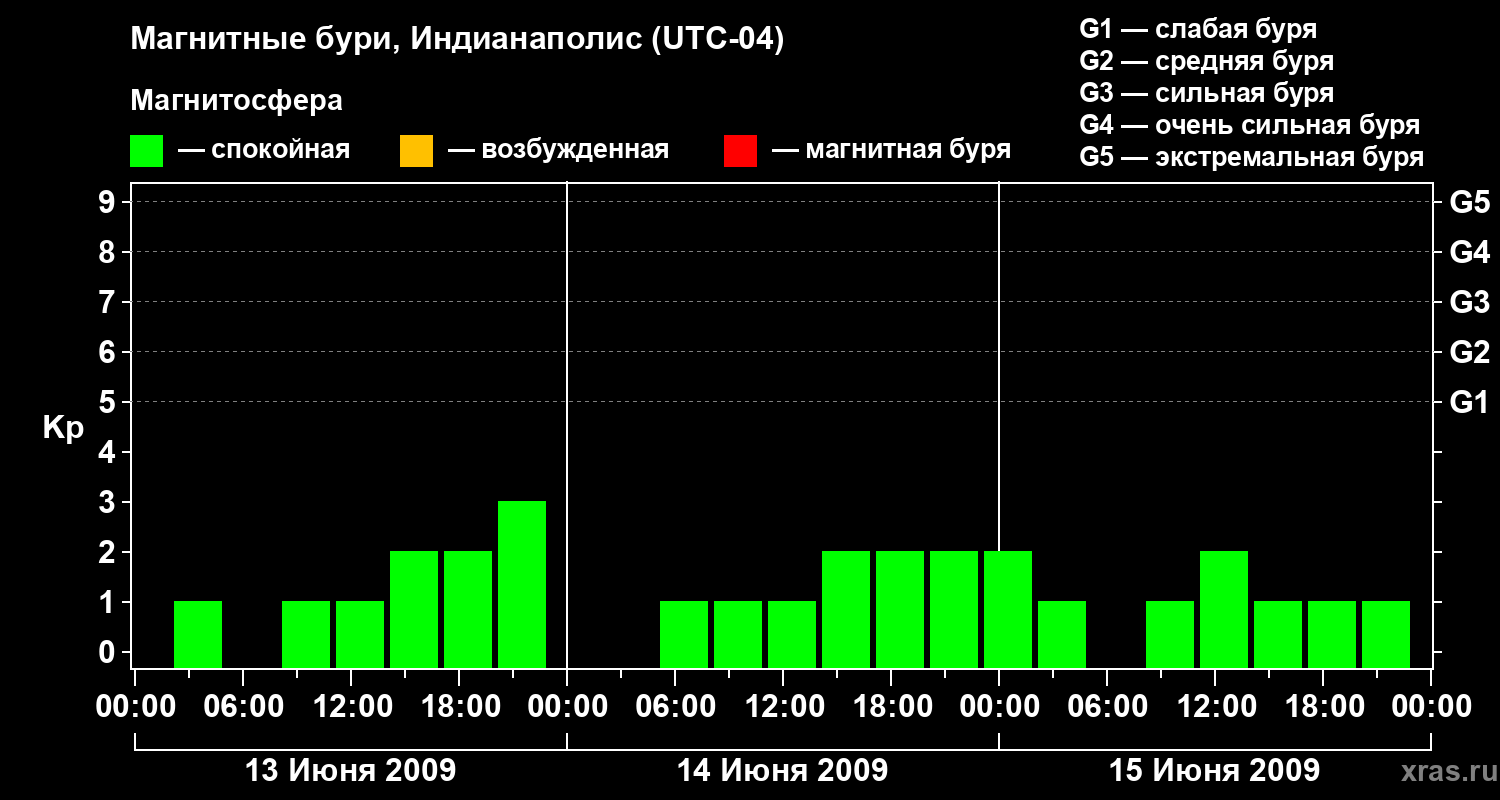 Изменения геомагнитного индекса Kp с 13 по 15 июня 2009 года для средних широт
