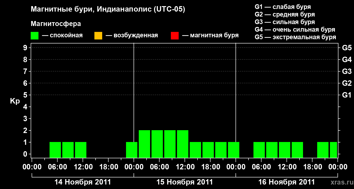 Изменения геомагнитного индекса Kp с 14 по 16 ноября 2011 года для средних широт