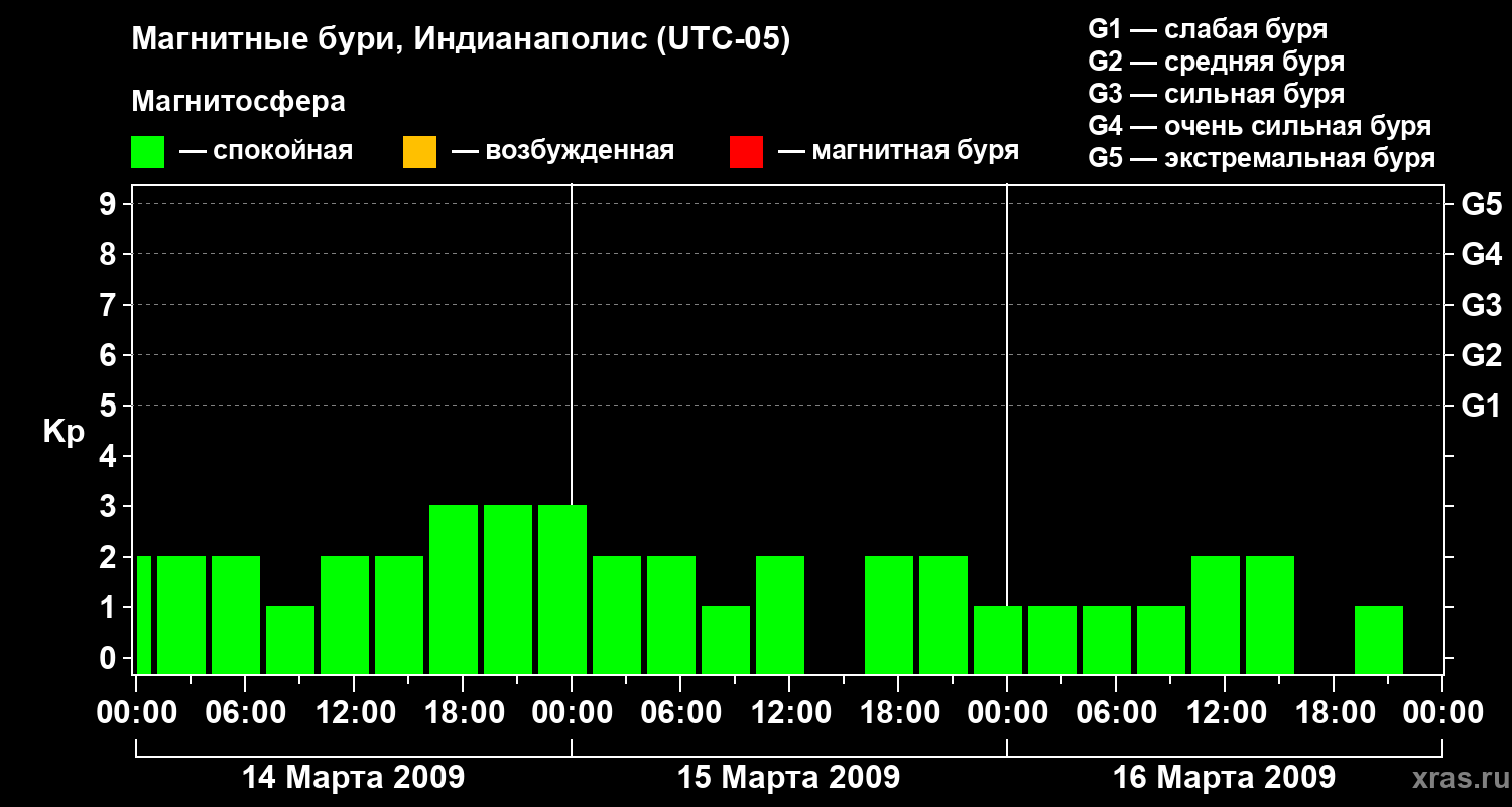 Изменения геомагнитного индекса Kp с 14 по 16 марта 2009 года для средних широт