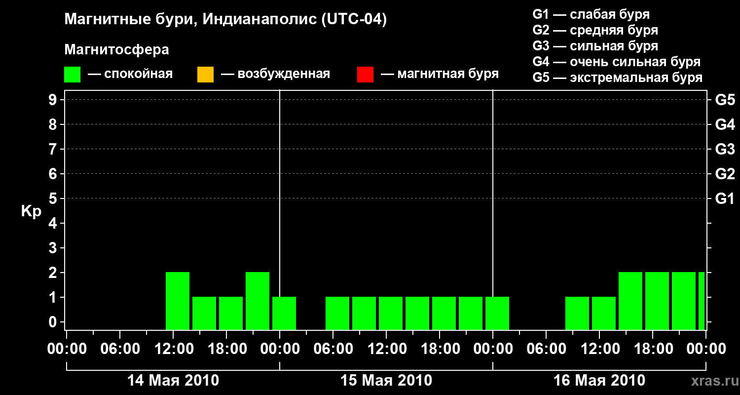 Изменения геомагнитного индекса Kp с 14 по 16 мая 2010 года для средних широт