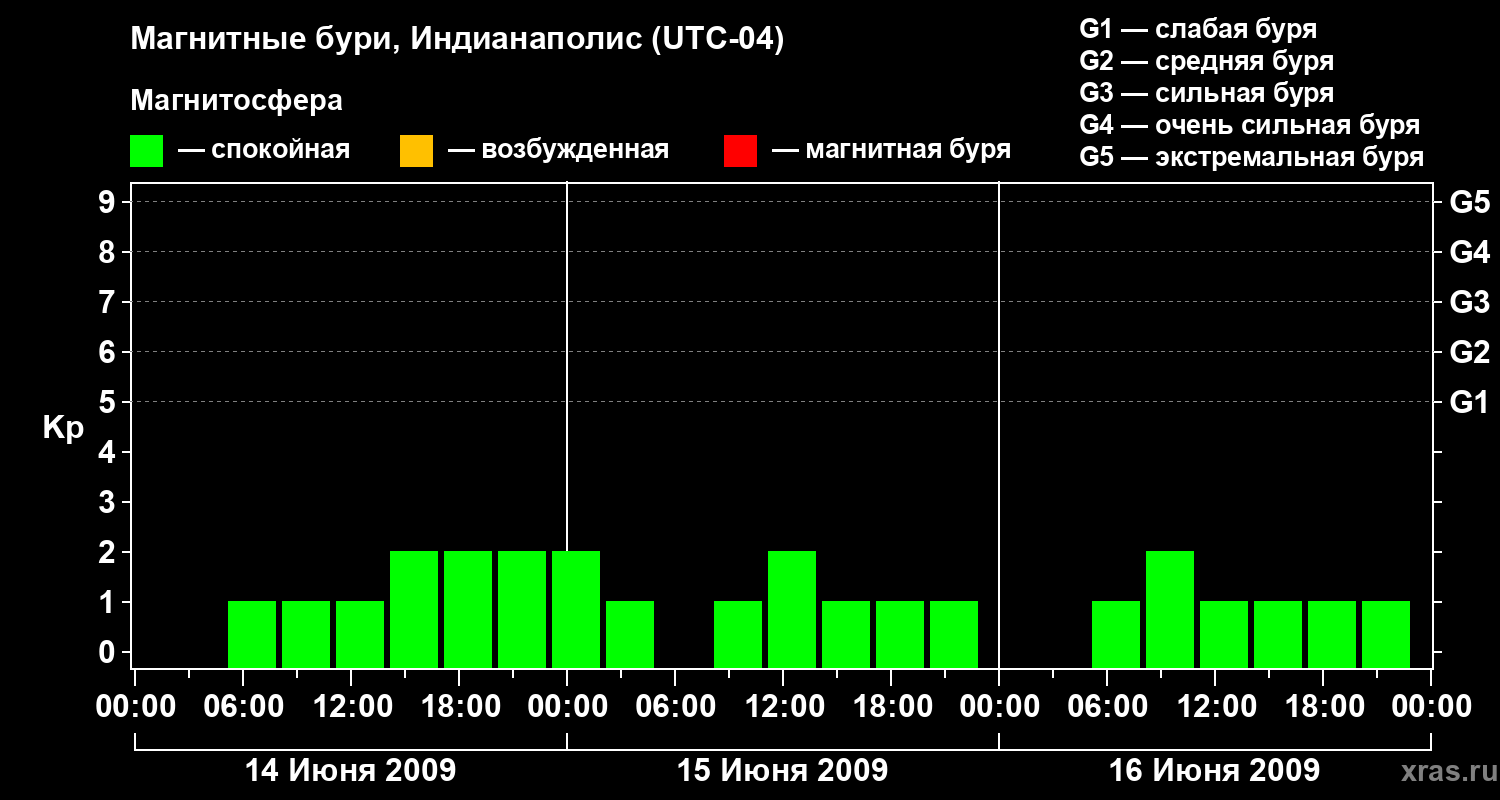 Изменения геомагнитного индекса Kp с 14 по 16 июня 2009 года для средних широт