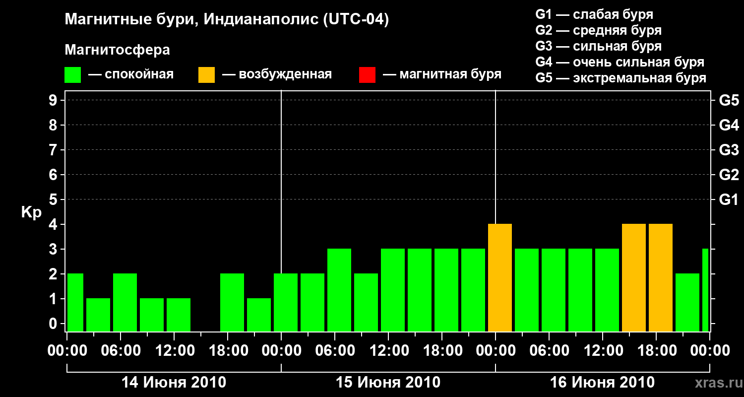 Изменения геомагнитного индекса Kp с 14 по 16 июня 2010 года для средних широт