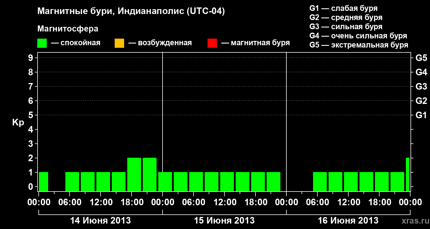 Изменения геомагнитного индекса Kp с 14 по 16 июня 2013 года для средних широт