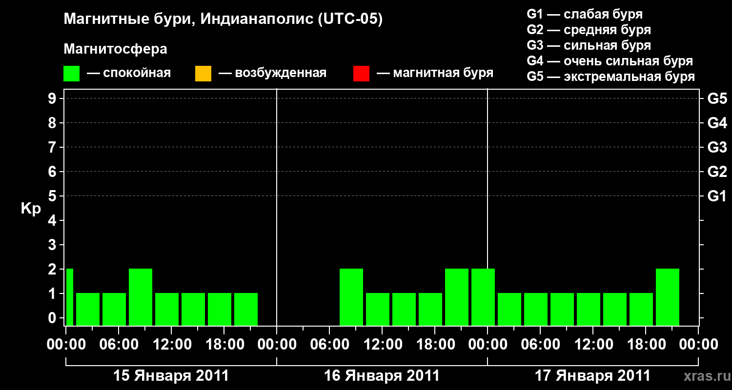 Изменения геомагнитного индекса Kp с 15 по 17 января 2011 года для средних широт
