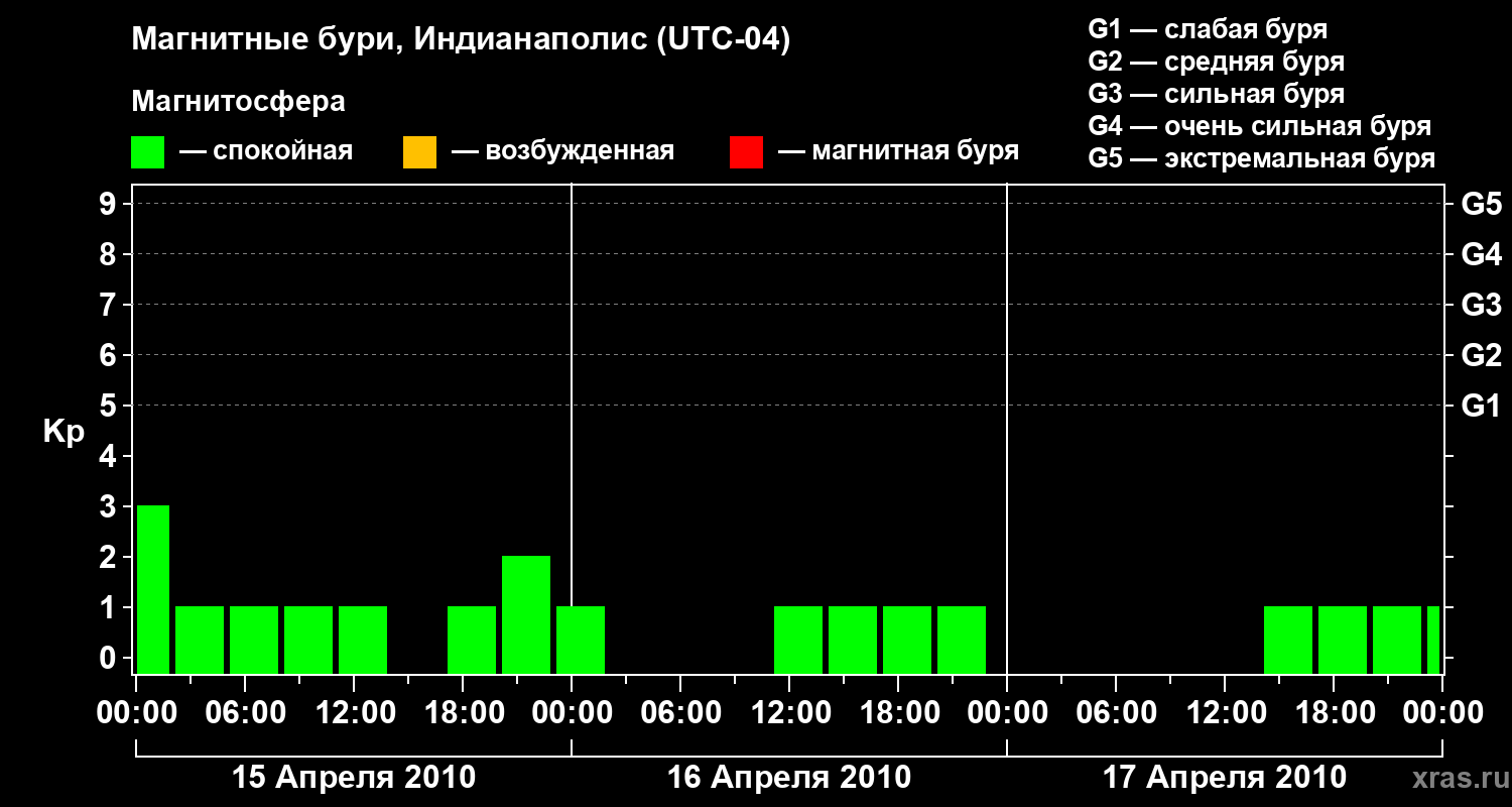 Изменения геомагнитного индекса Kp с 15 по 17 апреля 2010 года для средних широт