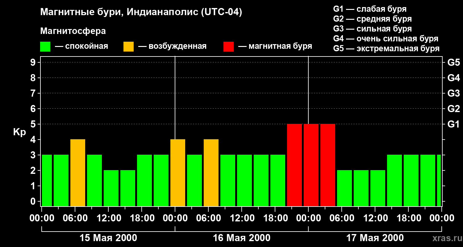 Изменения геомагнитного индекса Kp с 15 по 17 мая 2000 года для средних широт