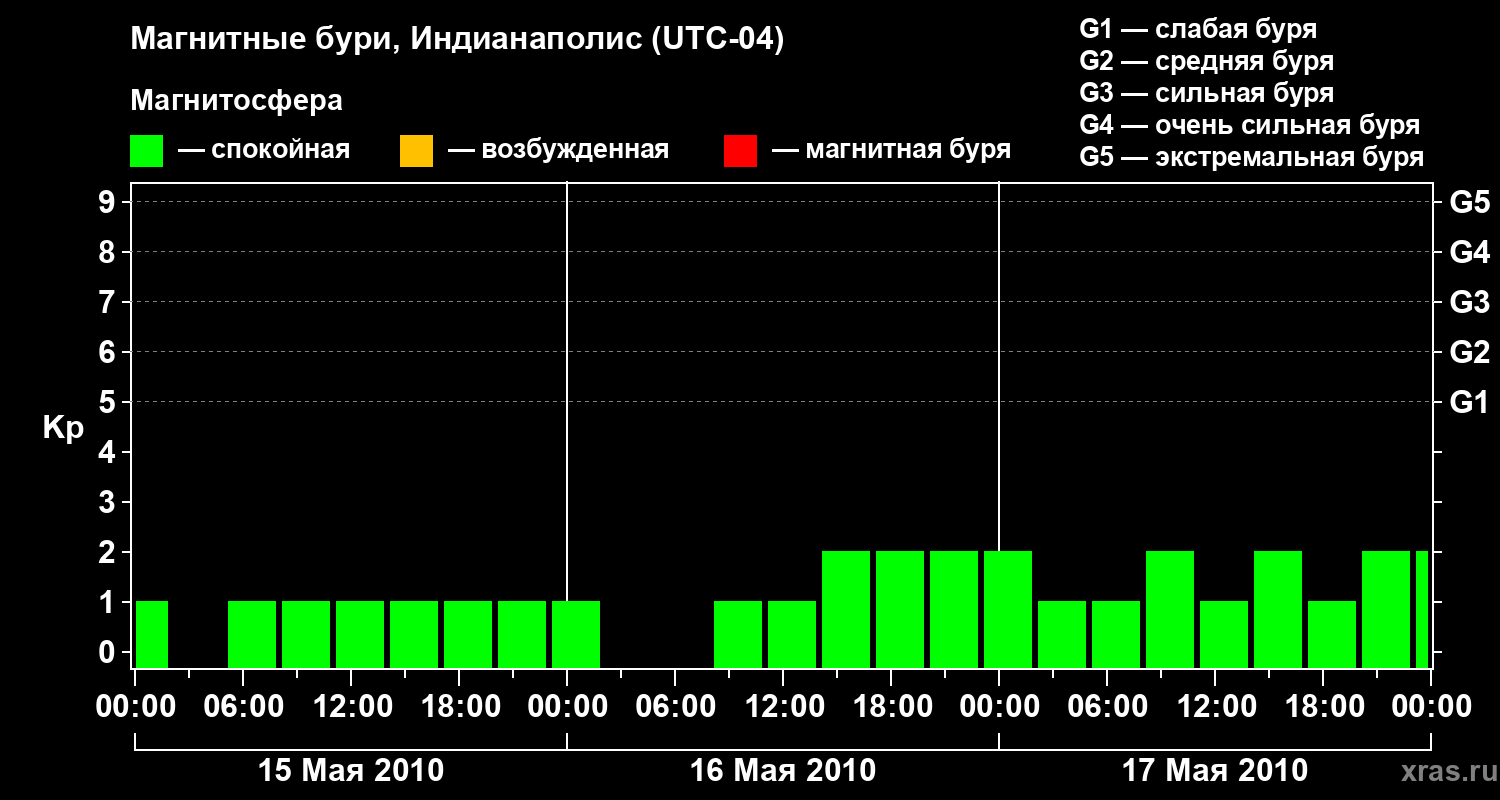 Изменения геомагнитного индекса Kp с 15 по 17 мая 2010 года для средних широт