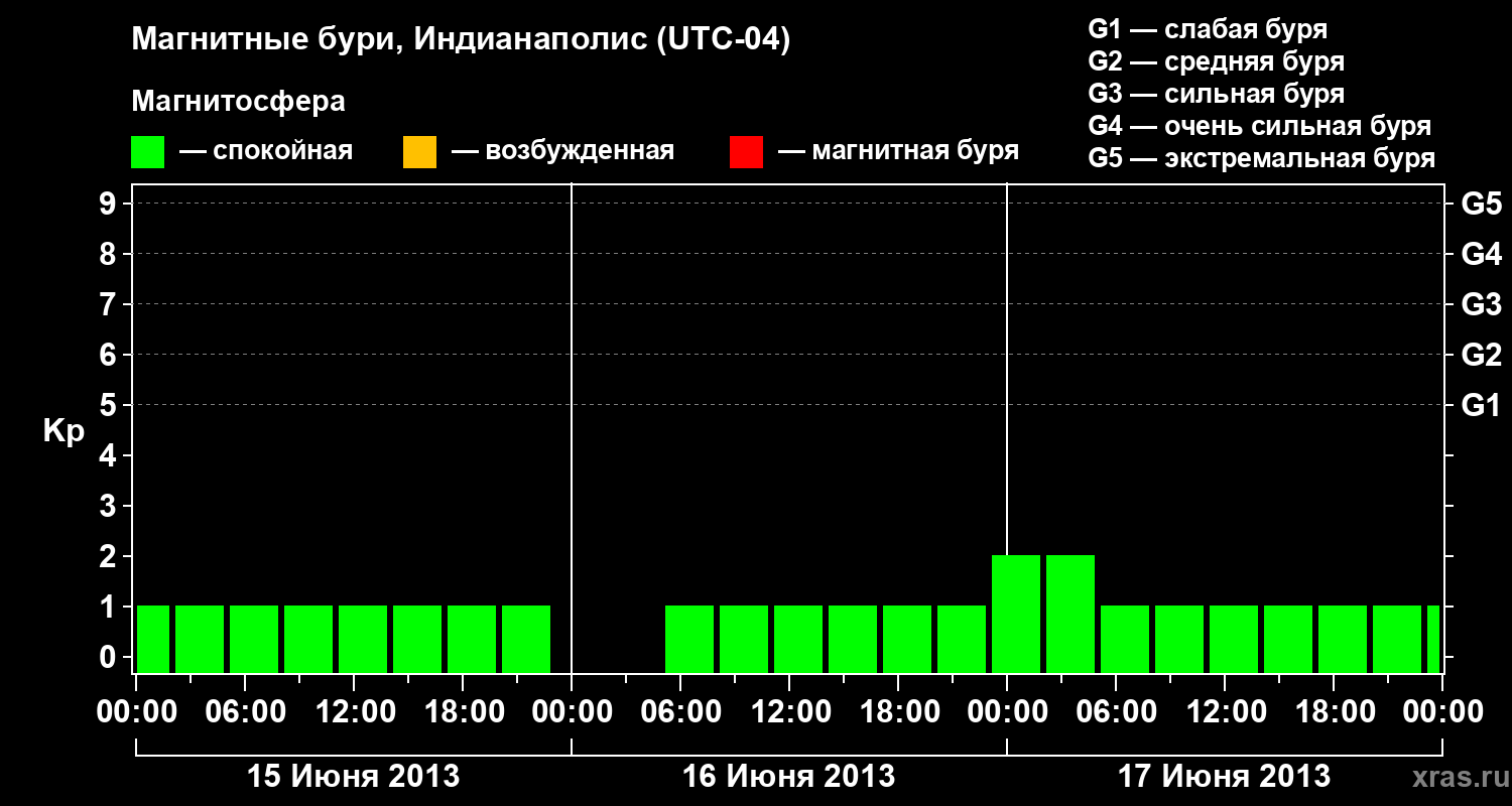 Изменения геомагнитного индекса Kp с 15 по 17 июня 2013 года для средних широт