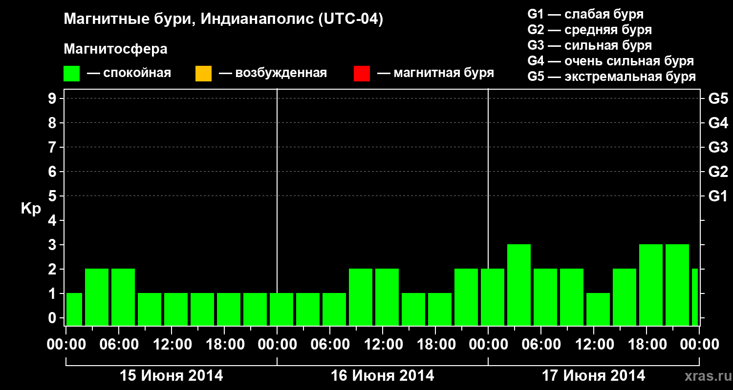 Изменения геомагнитного индекса Kp с 15 по 17 июня 2014 года для средних широт