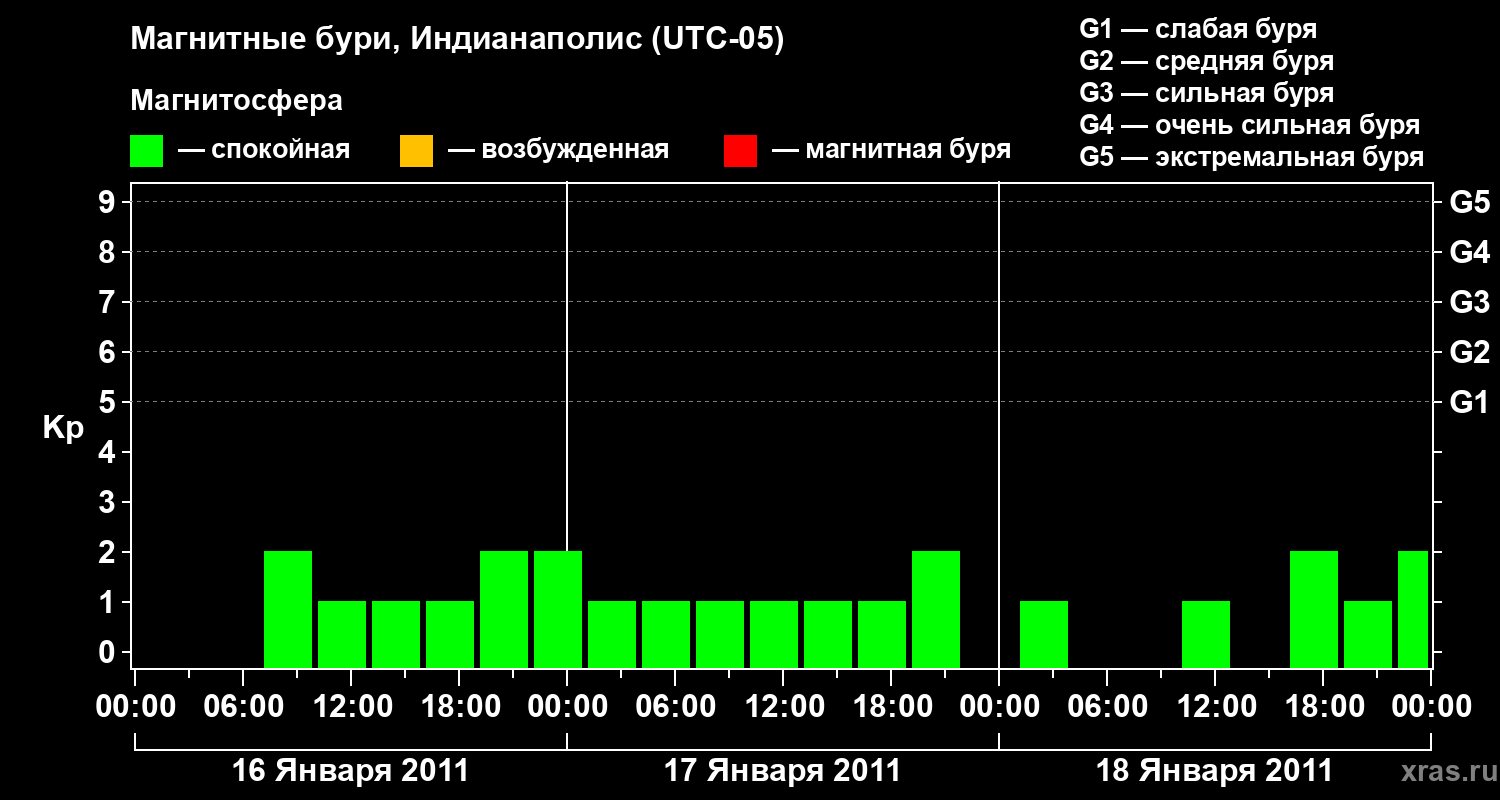 Изменения геомагнитного индекса Kp с 16 по 18 января 2011 года для средних широт