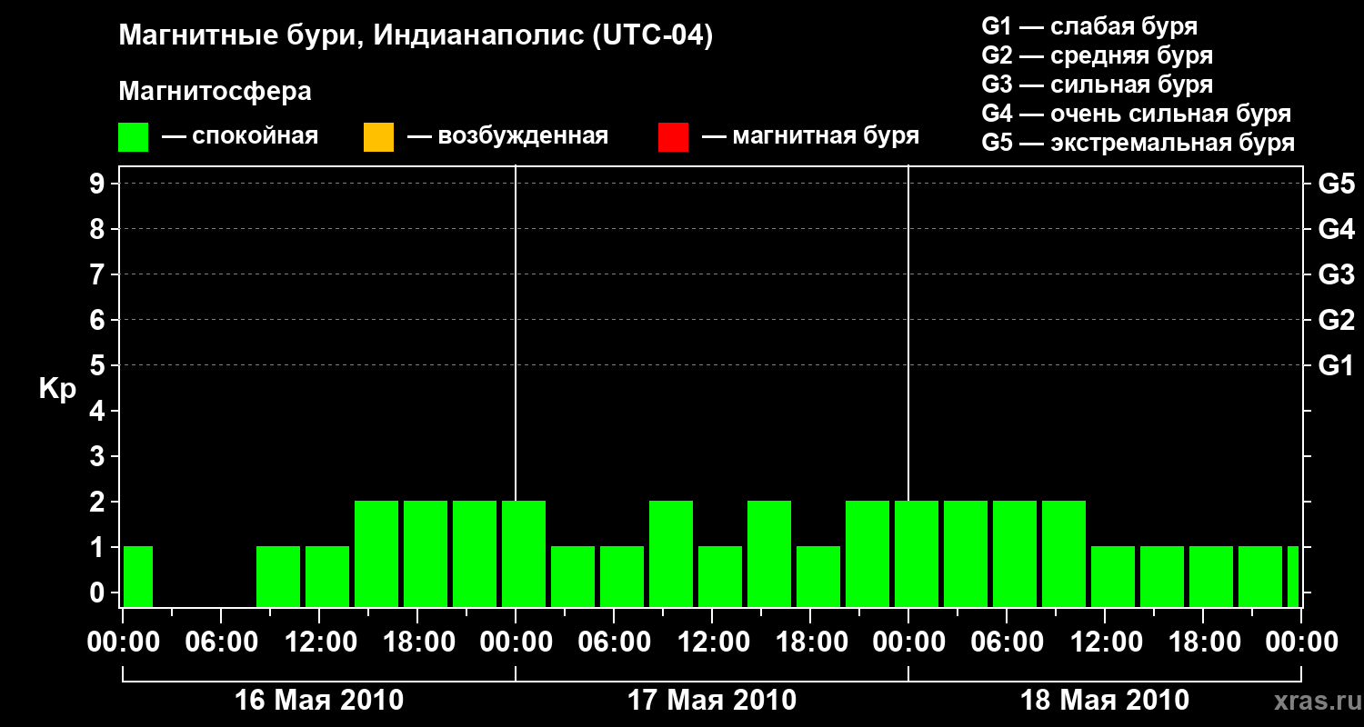 Изменения геомагнитного индекса Kp с 16 по 18 мая 2010 года для средних широт