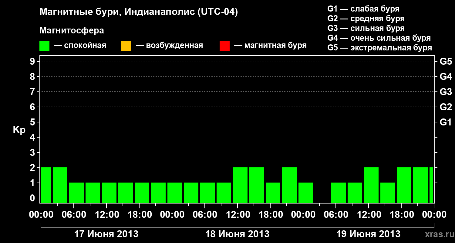 Изменения геомагнитного индекса Kp с 17 по 19 июня 2013 года для средних широт